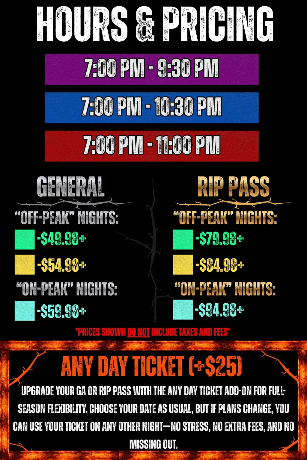 Pure Terror Scream Park is mainly an indoor attraction with a few outdoor sections, and as such, severe weather conditions may impact our operations. In the rare event that we are forced to close due to weather, your ticket will be valid for any other open night during the current 2025 season. No refunds will be issued for any reason, including weather-related closures. All sales are final.